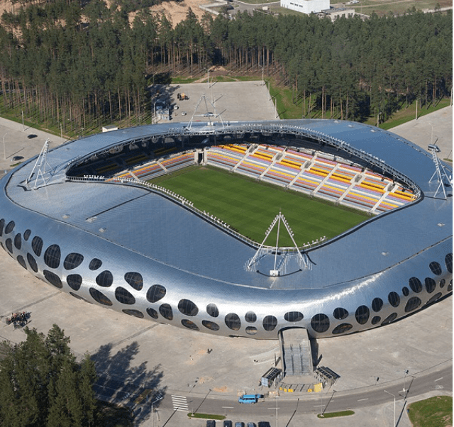 Borisov was a different proposition; a new build, with more space available set within a pine forest on the outskirts of the town. The challenge here was to integrate a stadium with its immediate environment. Whilst the shape and look is not particularly in keeping with what you might expect in a forest, the way that the parking has been hidden amongst the trees, and the landscaping has been provided by nature, means that this unusual design doesn’t seem too out of place. Natural light and ventilation come from the spots around the aluminium skin, which are semi-transparent and vented. This skin also keeps the worst of the Belarusian weather out and enhances the atmosphere inside, which BATE’s players are said to appreciate as it makes the stadium feel full even with a lower attendance for their smaller league games.